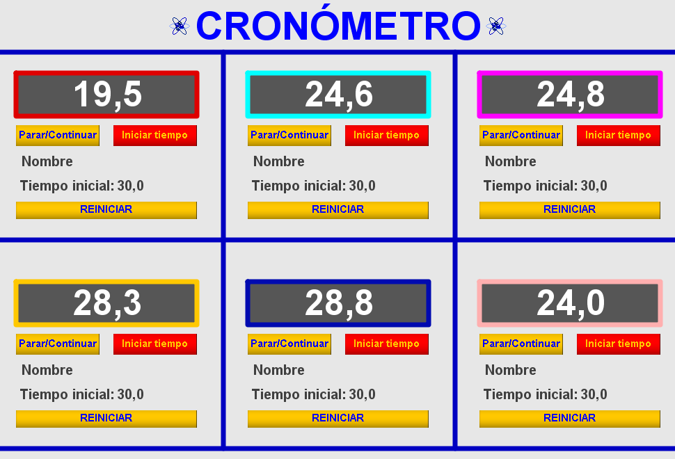 - Cronómetros. Permiten determinar el tiempo que los participantes emplean su participación en los juegos. El "juego" Marcadores también incluye una colección de cronómetros. Estos tienen cuanta hacia adelante o hacia atrás, se puede parar el crono, reiniciarse... Hay cronómetros individuales y paneles de cronómetros para equipos