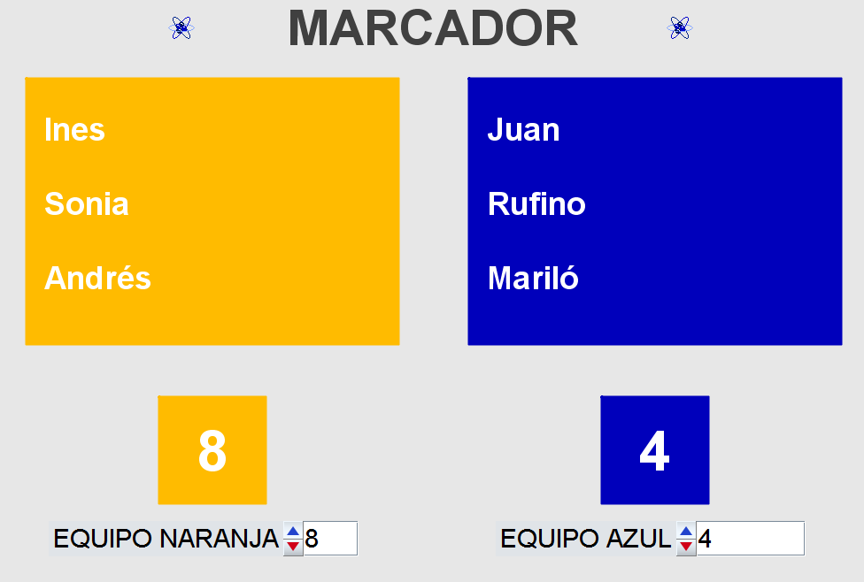 - Marcadores. En ellos se pueden recoger los resultados obtenidos por los distintos participantes. Se ha realizado un "juego" especifico, denominado "MARCADORES", que contiene una colección de marcadores y contadores de distinto tipo y diseño. También se pueden encontrar marcadores especíícos para los siguientes juegos: Password (apartado marcador), La escalera (apartado general), Cada sabio con su tema (apartado instrucciones) y Tres sabios (apartado instrucciones). Para utilizar los marcadores simplemente hay que introducir los nombres de los jugadores o equipos y la puntuación que estos vayan consiguiendo a lo largo del juego. A continuación se muestran algunas imágenes de marcadores.